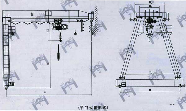半门式起重机与CD,MD型电动葫芦配套使用,是一种有轨运行的小型起重机。它的金属结构像门形框架,承载主梁下安装两条支脚,可以直接在地面的轨道上行走,主梁两端可以具有外伸悬臂梁。门式起重机具有场地利用率高、作业范围大、适应面广、通用性强等特点。